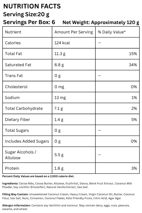 Β Cocoa Nibs, Cocoa Butter, Allulose, Erythritol, Stevia, Monk Fruit Extract, Coconut milk powder, Soy Lecithin (Emulsifier), Natural Vanilla Extract, Sea Salt.
